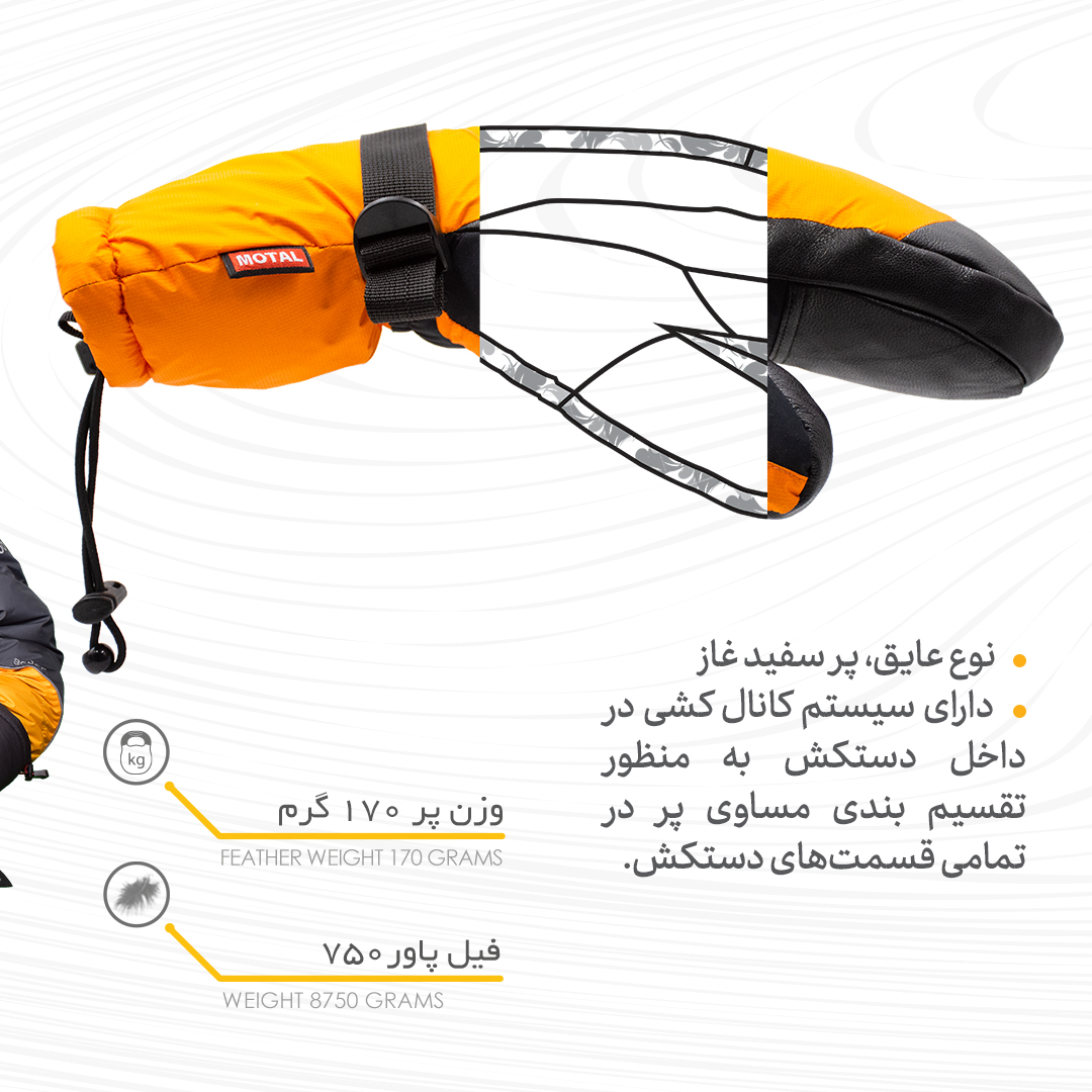 دارای سیستم کانال کشی در داخل دستکش به منظور تقسیم بندی مساوی پر در تمامی قسمتهای دستکش