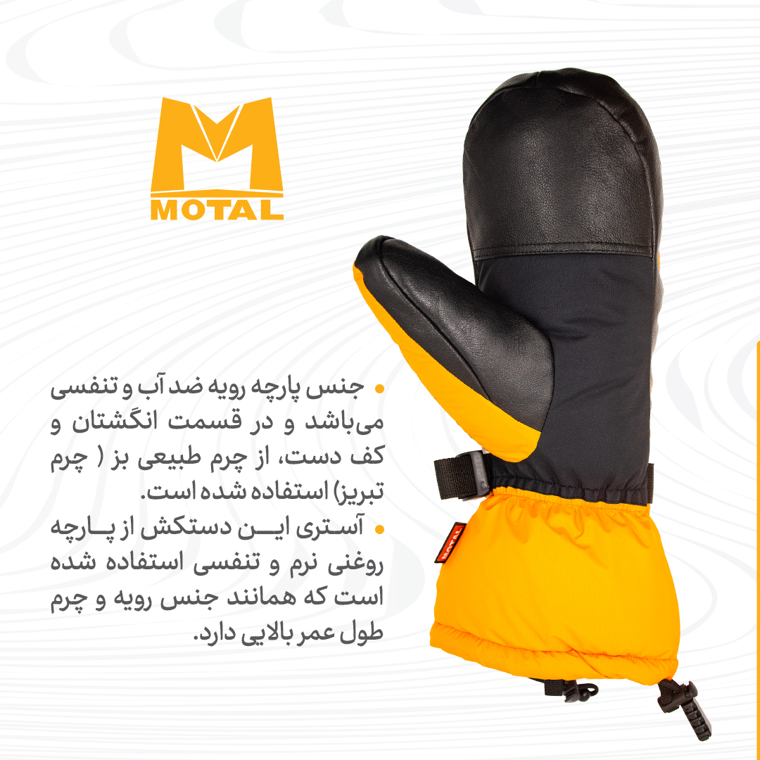 جنس پارچه رویه ضد آب تنفسی میباشد و در قسمت انگشتان و کف دست از چرم طبیعی بُز (چرم تبریز) استفاده شده است
