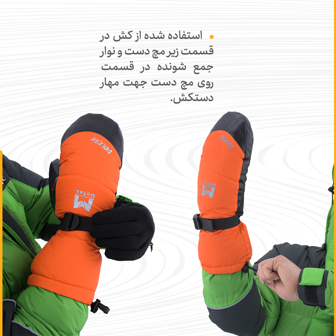 استفاده شده از کِش در قسمت زیر مچ دست و نوار جمع شونده در قسمت روی مچ دست جهت مهار دستکش